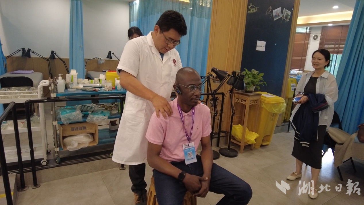 马里新闻广告社《发展报》加奥大区主管阿卜杜拉马内·图雷体验中医把脉看诊。(湖北日报全媒记者 沈早慧/摄)
