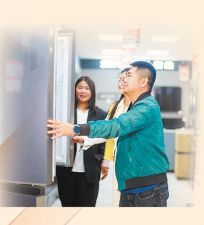 消费者在贵州黔西莲城街道一家商场家电大卖场内选购家电产品。