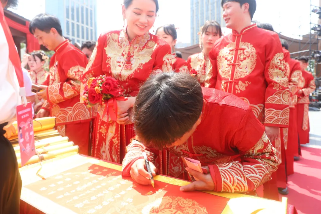 当天,参加集体婚礼的20对新人陆续抵达,新郎们身着朱红缎面长衫,金丝盘龙纹自襟口蜿蜒至袍角勾勒出挺拔身姿。新娘们曳地的绛红旗袍上金丝鸾凤振翅欲飞,珍珠流苏步摇更令佳人顾盼生辉,恍若从民国画卷中走出的璧人。