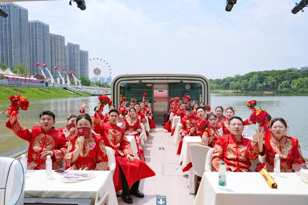特别为这一天打造的520路婚庆专列从登记处幸福启航,载着新人们的欢笑声,缓缓驶向槐荫河岸边的槐荫船说广场,似要将这份甜蜜撒向整座城市。