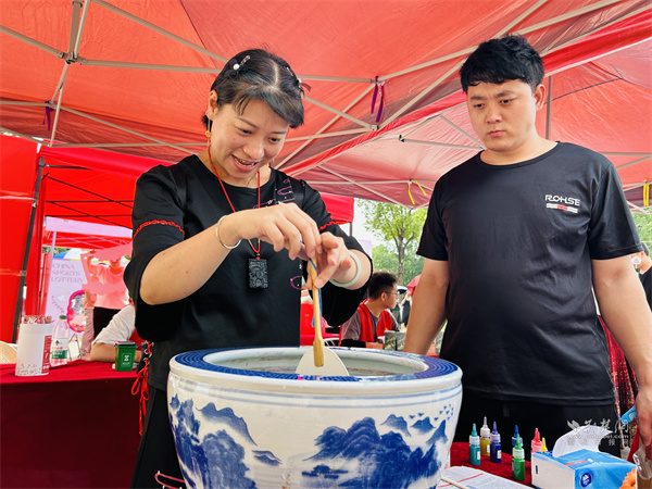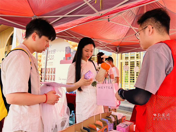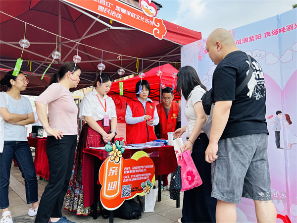 紫阳湖畔设立婚育宣传区,为即将步入婚姻殿堂的新人打造集浪漫、唯美、温馨为一体的“520”专属体验。活动设置“漆扇传情·非遗承新”“风铃祈愿·幸福连线”“囍结良缘”等主题打卡点,新人们现场体验非遗技艺,在传统与现代的婚俗中完成幸福寄语,领取象征“清风吹散旧俗”的风铃,清脆的响铃成为文明新风的流动风景。“用非遗技艺见证婚姻,既有仪式感又有文化味。”新人李女士轻抚扇面说道。