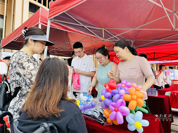 在“爱心手作・以爱筑家”环节,阳光家园残疾手艺人现场制作婚育主题气球,义卖所得注入社区公益金,为新人提供“婚姻登记+公益捐赠”的特殊体验,既为新人留存浪漫纪念,又倡导了“小善聚大爱”的公益理念。