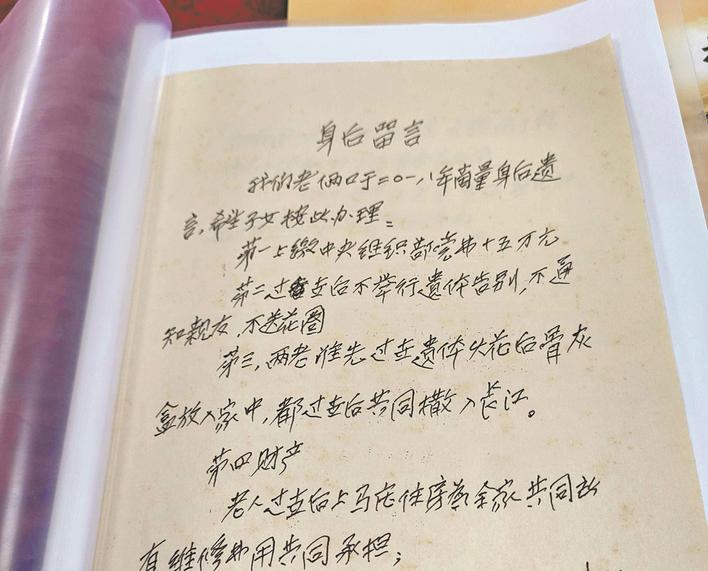 袁晋程的大儿子袁大桥说,看到遗嘱的时候,父亲已经切开了气管,告诉他遗嘱找到了,父亲也不能说话。父亲去世后,2024年年底,他们按照遗嘱的安排,将父亲的15万元积蓄交给干休所,作为大额党费上缴。父亲的后事也一切从简。唯一的遗憾是,母亲去世的时候他们不知道父母已经写好了遗嘱,办后事的时候已经为父母买好了合葬墓,因此他们的骨灰没有能撒入长江。
