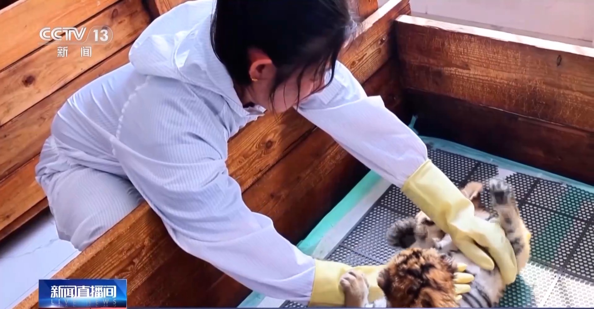 刚出生的虎崽只有3斤左右,会被放在保温箱里,经过半个月左右的恒温保育后,会被转移到围栏里。这里的东北虎幼崽的体毛非常浓密顺滑,这是因为它们一直喝的都是经过科学配比的专用奶粉。
