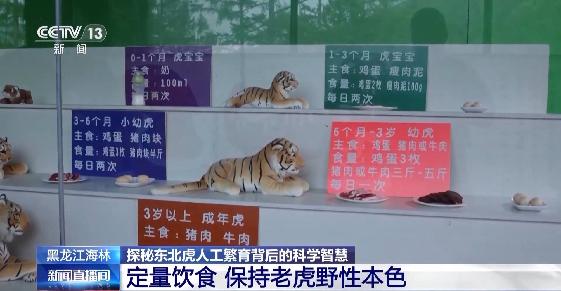 老虎需不需要管理体重呢?是越胖越好吗?在这里能清晰地看到东北虎不同年龄段的饮食图谱。饲养员告诉记者,保持适当体重对老虎至关重要,身体过胖会影响它的野外生存能力,所以他们会通过控制食量和增加运动量,让老虎始终保持健壮体魄。