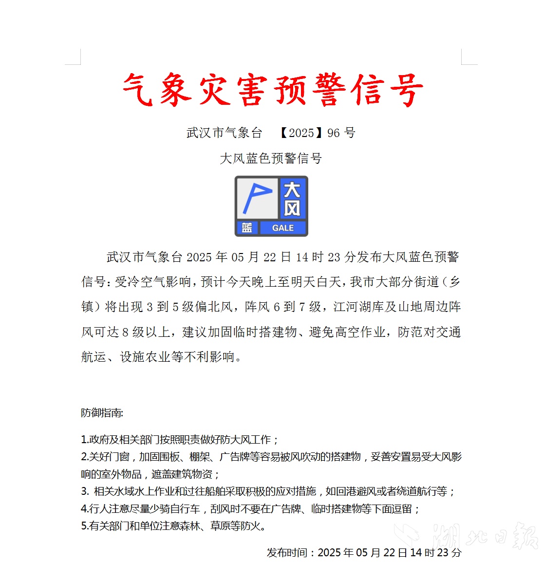 武汉市气象台5月22日14时23分发布大风蓝色预警信号:受冷空气影响,预计今天晚上至明天白天,武汉市大部分街道(乡镇)将出现3到5级偏北风,阵风6到7级,江河湖库及山地周边阵风可达8级以上,建议加固临时搭建物、避免高空作业,防范对交通航运、设施农业等不利影响。