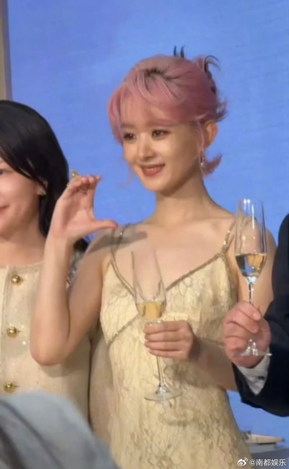 赵丽颖一改往日乖乖造型,以浅粉色短发搭配裸全背绿色长裙造型亮相,一身打扮明媚漂亮,水灵灵的宛如仙女一般,被夸是“真人芭比”。