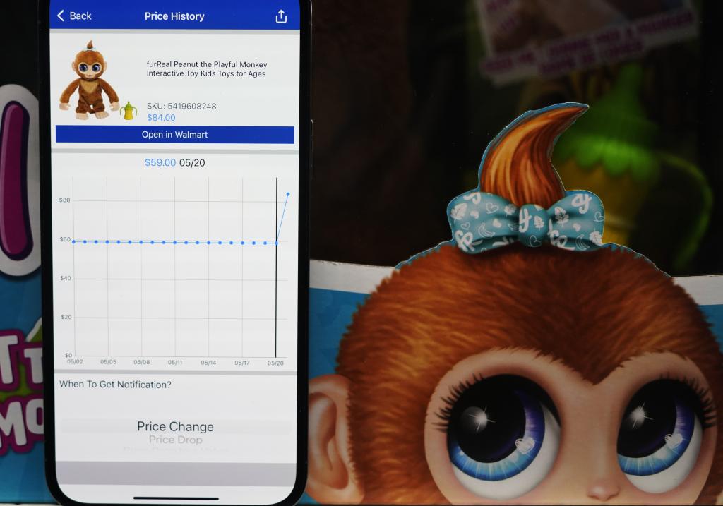 5月21日,在美国旧金山湾区圣利安卓San Leandro的一家沃尔玛超市,价格跟踪软件(Walmart Tracker)显示商品(中国产毛猴玩具)售价变化。新华社记者吴晓凌摄