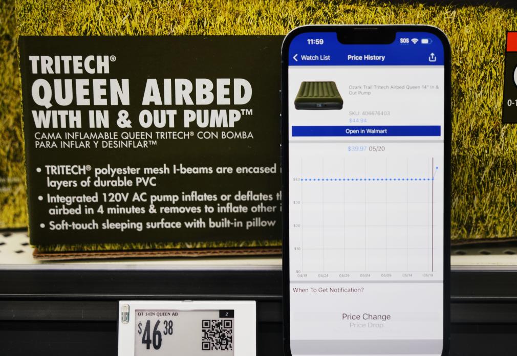 5月21日,在美国加利福尼亚州旧金山湾区圣莱安德罗的一家沃尔玛超市,价格跟踪软件显示一款中国产充气床垫售价变化情况。新华社记者 吴晓凌 摄