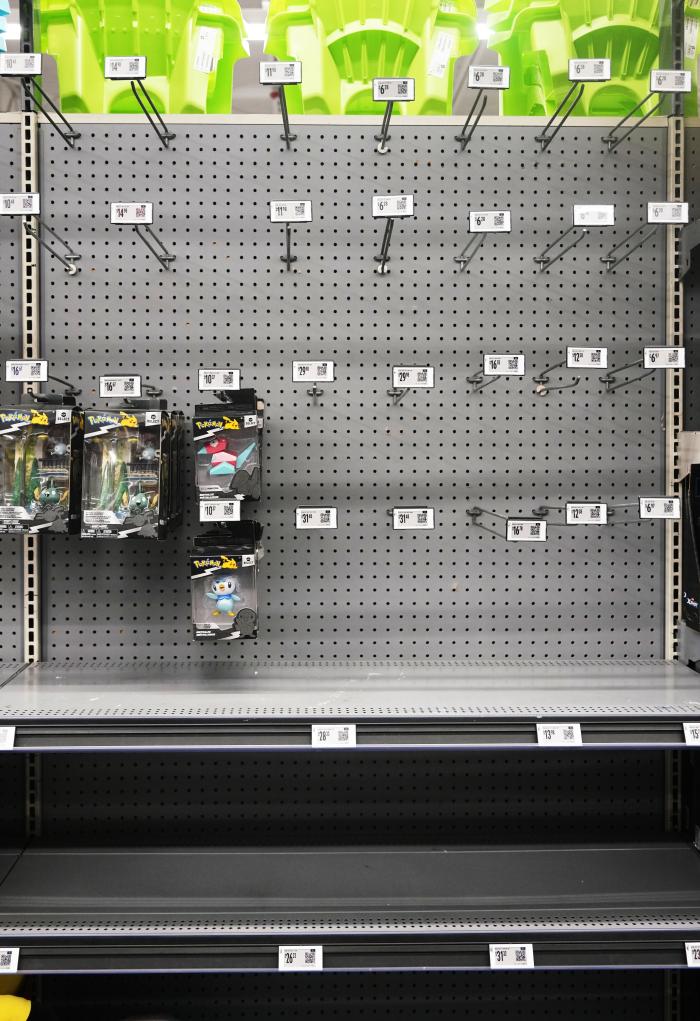 除了价格上涨,这家门店的部分玩具、自行车和家用电器货架空空荡荡,只剩还没有撤下的价签。