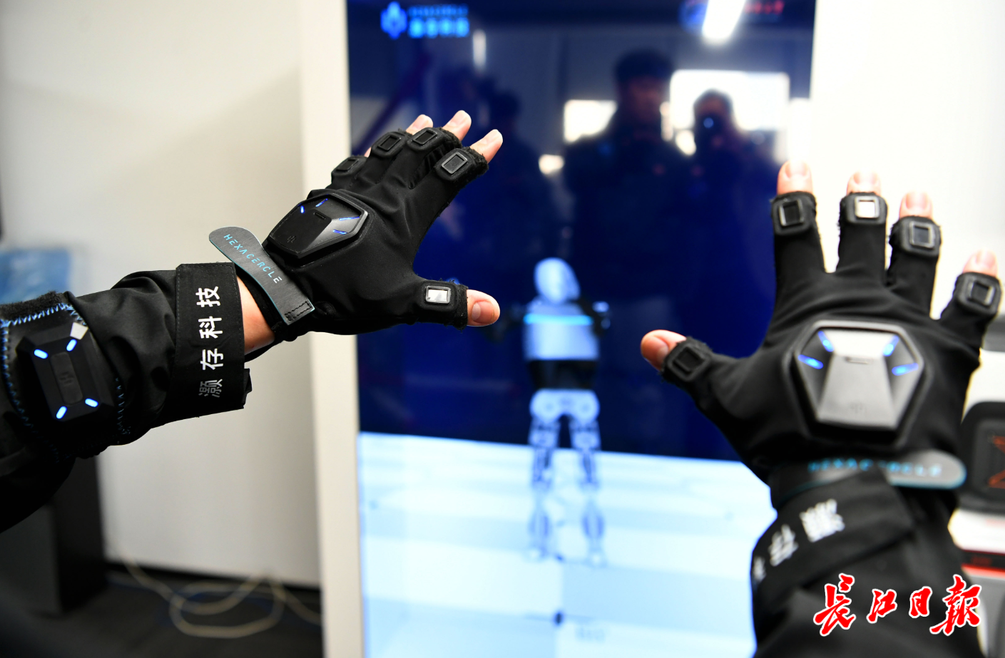 武汉灏存科技设计人员戴着人工智能数据手套进行人形机器人动作训练。 长江日报记者高勇 摄
