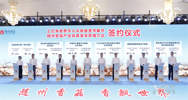 荆楚网(湖北日报网)讯(通讯员 龙建红 鲁心怡)5月22日,乙巳年世界华人炎帝神农故里寻根节随州香菇产业高质量发展推介活动在随县隆重举行,来自全国各地的政府代表、专家学者、企业代表160余人齐聚一堂,共谋合作共赢新篇章。湖北农发集团旗下省粮油进出口集团与随县人民政府签约湖北茶叶集团茶叶加工及外贸项目,湖北香菇集团与品源(随州)现代农业签约菌种制棒标准化种植基地一体化项目。