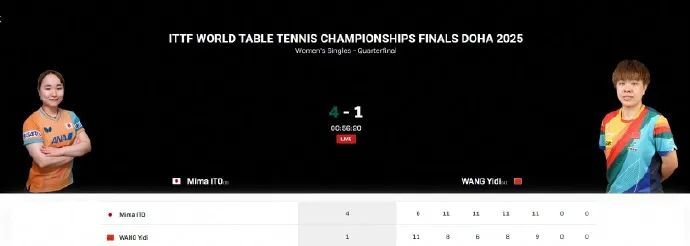 5月23日,2025多哈世乒赛女单1/4决赛,王艺迪1比4不敌伊藤美诚无缘半决赛,五局比分11-6,8-11,6-11,8-11,9-11。