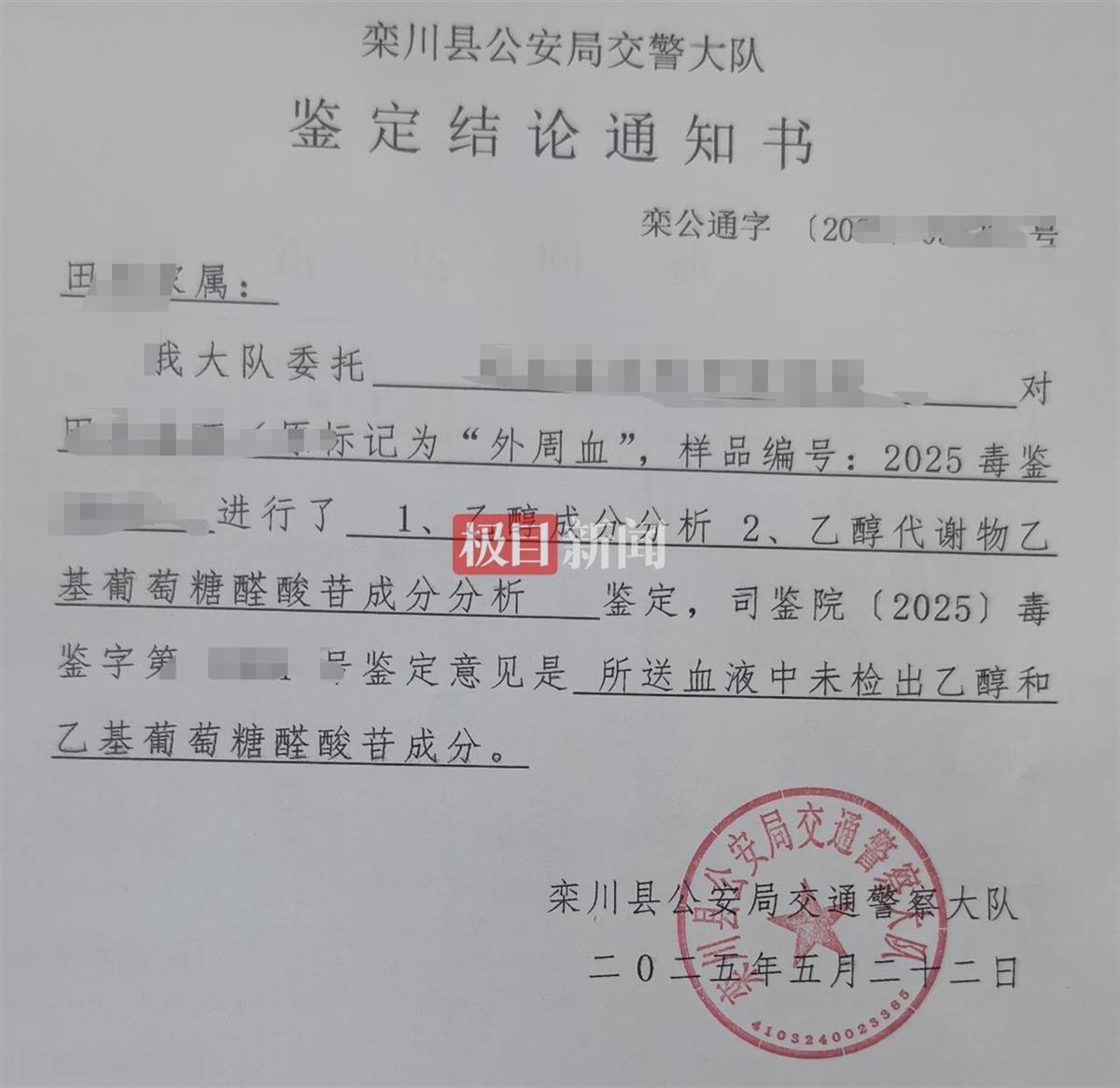 5月23日下午,极目新闻记者从田某家属处了解到,第二次检验结果已出。记者获得的一份栾川县公安局交警大队鉴定结论通知书显示,该大队委托司法鉴定科学研究所对田某血液(“外周血”)进行乙醇成分分析等相关鉴定。鉴定意见为:所送血液中未检出乙醇和乙基葡萄糖醛酸苷成分。印章为栾川县公安局交通警察大队,落款时间为2025年5月22日。