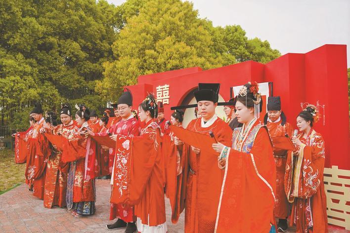 国风集体婚礼引领文明新风气。