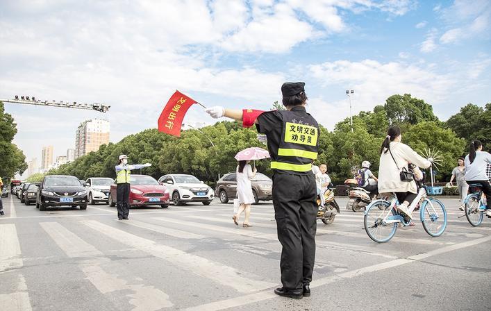在交通路口、大街小巷等处,黄石文明宣导员开展文明宣导,让文明创建融入群众生活。