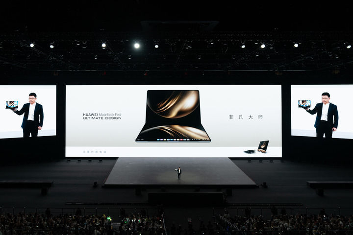 2025年5月19日,华为常务董事、终端BG董事长余承东在成都举办的发布会上介绍HUAWEI MateBook Fold非凡大师电脑。当日,华为在成都正式发布两款鸿蒙电脑,这是鸿蒙操作系统首次在电脑端正式发布,在电脑操作系统领域迈出新步伐。新华社记者 胥冰洁 摄