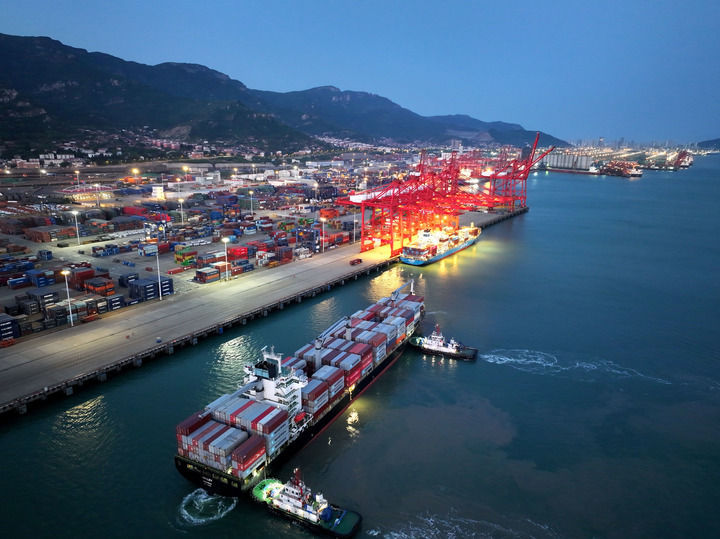 2025年5月2日凌晨,一艘货轮缓缓停靠江苏省连云港港集装箱码头泊位,准备卸运集装箱(无人机照片)。新华社发(王春摄)