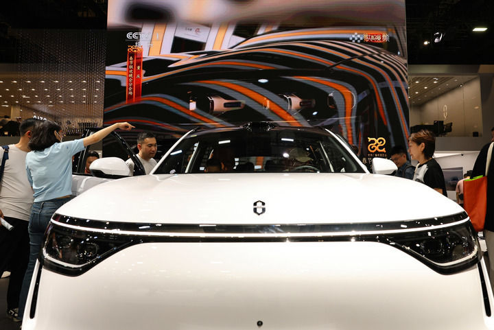 2025年5月1日,参观者在第二十一届上海国际汽车工业展览会上的一辆问界M8展车旁交流。新华社记者 方喆 摄