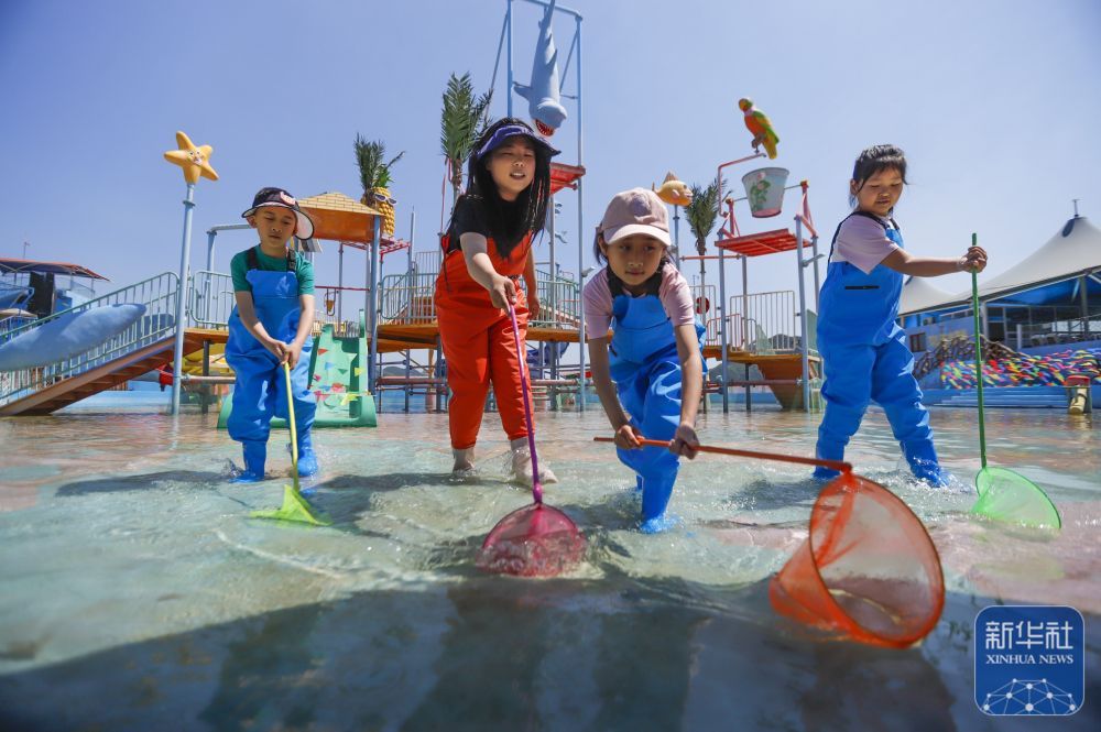 ↑ 5月24日,游客在河北省遵化市南山常乐谷景区水世界参加亲子捞鱼活动。新华社发(刘满仓摄)