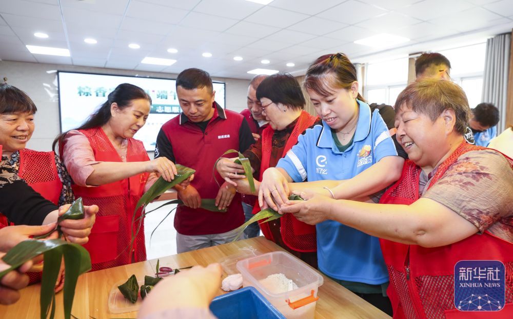 ↑ 5月23日,江苏省淮安经济技术开发区的退休职工志愿者和快递员一起包粽子。新华社发(赵启瑞摄)