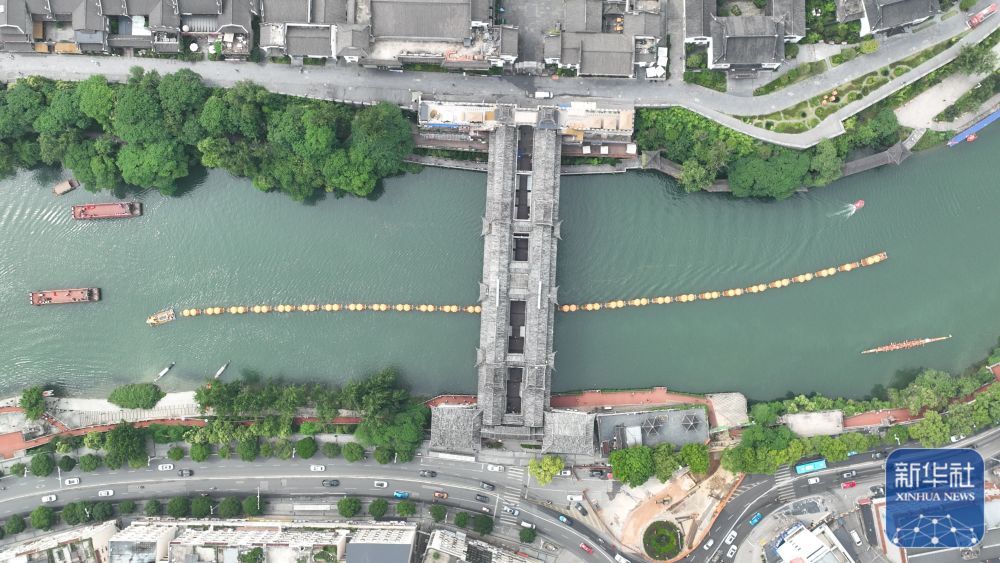↑ 5月24日,在贵州省铜仁市碧江区锦江水域,观光龙舟从风雨桥下穿过(无人机照片)。新华社发(申逸恺摄)