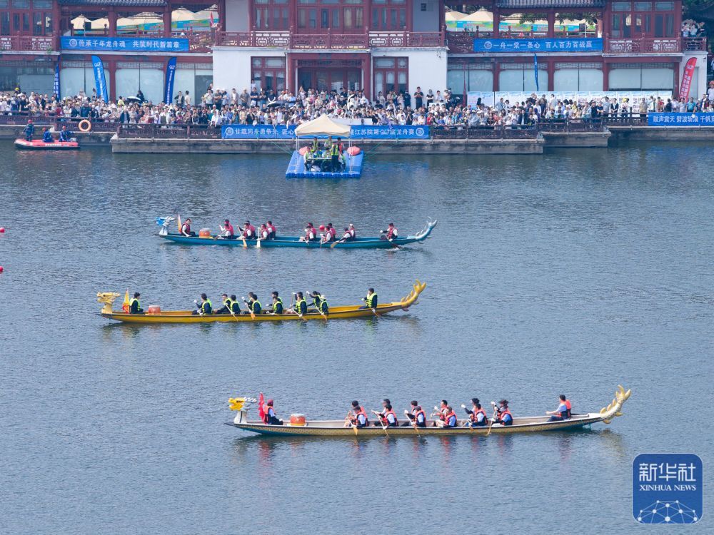 ↑ 5月24日,龙舟队在江苏省南京市莫愁湖公园参加比赛(无人机照片)。新华社发(杨素平摄)