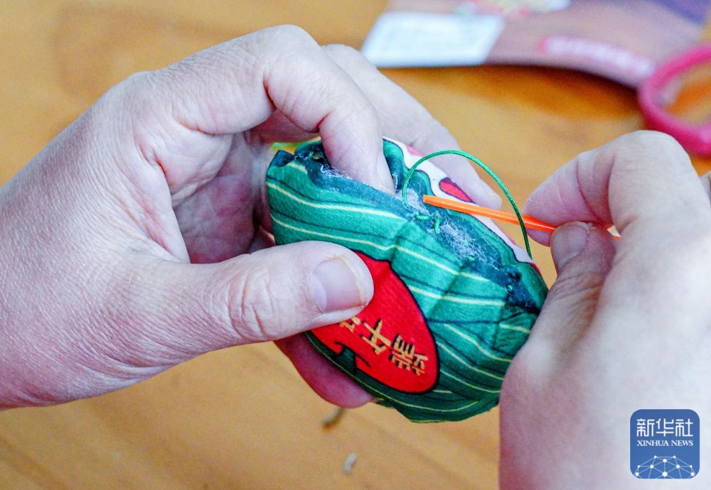 ↑ 5月23日,志愿者在山东省荣成市新时代文明实践中心制作香囊,准备送给孤寡老人。新华社发(李信君摄)