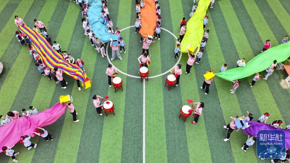 ↑ 5月23日,在山东省东营市广饶县李鹊镇中心幼儿园,小朋友在进行龙舟赛游戏(无人机照片)。新华社发(刘云杰摄)