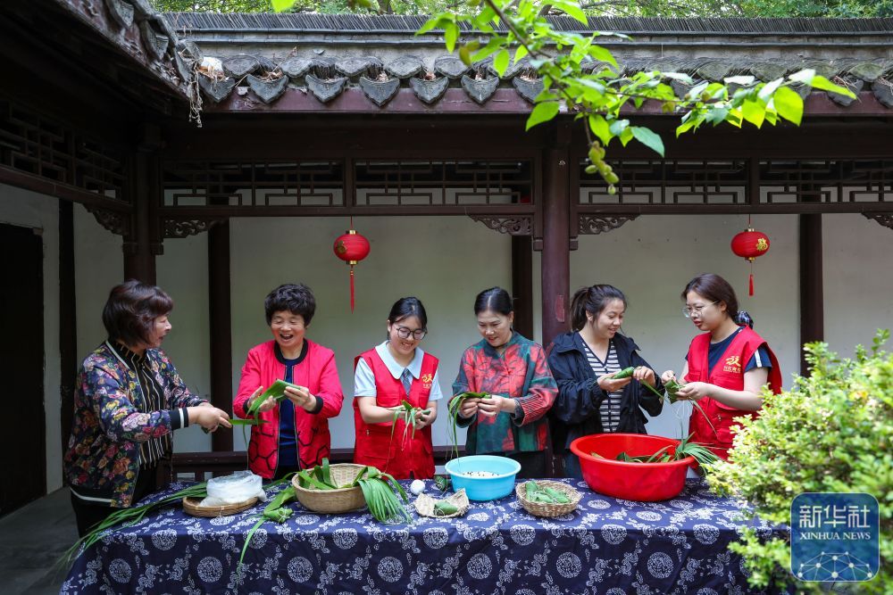 ↑ 5月24日,在位于江苏省兴化市昭阳街道的兴化书院,青年志愿者和社区居民一起包粽子。新华社发(周社根摄)