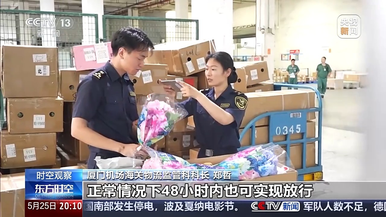 厦门机场海关物流监管科科长 郑哲:根据RCEP规则,像鲜花、生鲜这样的易腐产品,在成员国之间可以实现6小时内通关,不仅是易腐和快运货物,其他的空运一般货物在抵达后正常情况下48小时内也可实现放行。