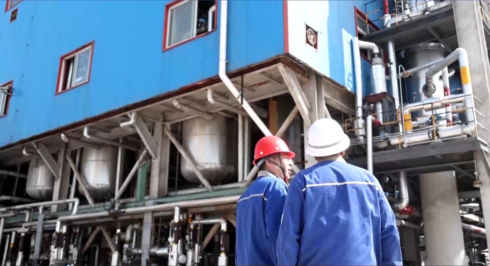 鑫岳化工集团的工作人员在厂房前。新华社记者 王欢 摄