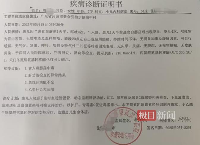 周女士是周某英的侄女,她向极目新闻记者出示的病历单显示,周某英和女儿于5月17日晚前后被送到河源市一家人民医院救治,病情及治疗过程显示,患者因“误服蘑菇1天余”入院。予告病危、心电监护、24小时留陪人,紧急置入右颈内静脉临时导管血液净化及血浆置换治疗,行毒素吸附、补液、护肝、护胃等治疗。目前,两人诊断为致死性蕈类中毒、急性肝衰竭、急性肾衰竭等,建议重症监护救治。