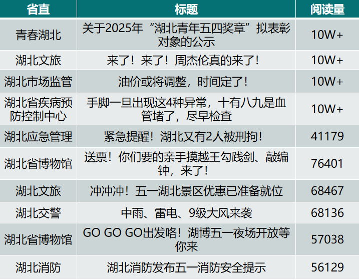 紧贴民众日常需求,民生资讯全面覆盖。民生无小事。4月,湖北省直微信公众号与民生相关的推文数量众多,内容涵盖考试信息、招聘提醒、天气预警和健康科普等多个方面。例如,“湖北省疾病预防控制中心”《手脚一旦出现这4种异常,十有八九是血管堵了,尽早检查》《你爱吃的4种食物,正偷偷升高尿酸!不想痛风尽量少碰》《吃饭时长期喝二三两白酒的人,身体都怎样了?告诉你真相》,针对血管堵塞、尿酸升高、饮酒危害等常见健康问题,为民众提供专业的解读和建议,每篇阅读量均获10万+。此外,“湖北市场监管”《油价或将调整,时间定了!》、“湖北人社”《2025年湖北事业单位笔试成绩已出!快查→》《有单位在招人,别错过!》,与油价、招聘考试等有关的推文传播效果良好。