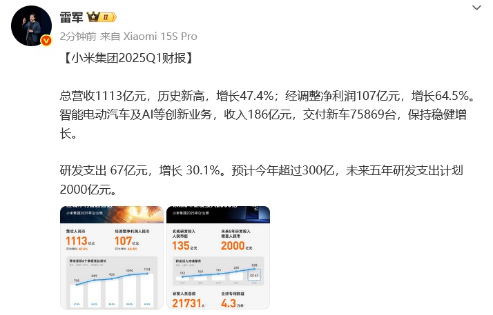 5月27日,雷军发文公布小米集团2025Q1财报: