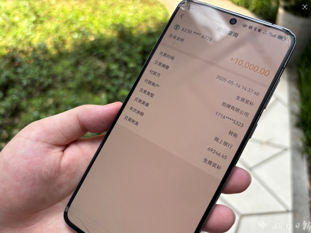在提交了孩子的出生证明等相关资料后,袁洪亮的工资卡上就收到了1万元生育奖励,他也成为劲牌公司第一个获得生育奖励的员工。“公司实实在在的补贴给了我们很大的经济支持和精神鼓励,家人都非常感谢,今后如果有条件我们还想再生一个。”袁洪亮说。