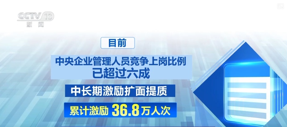 目前,中央企业管理人员竞争上岗比例已超过六成,中长期激励扩面提质,累计激励36.8万人次。