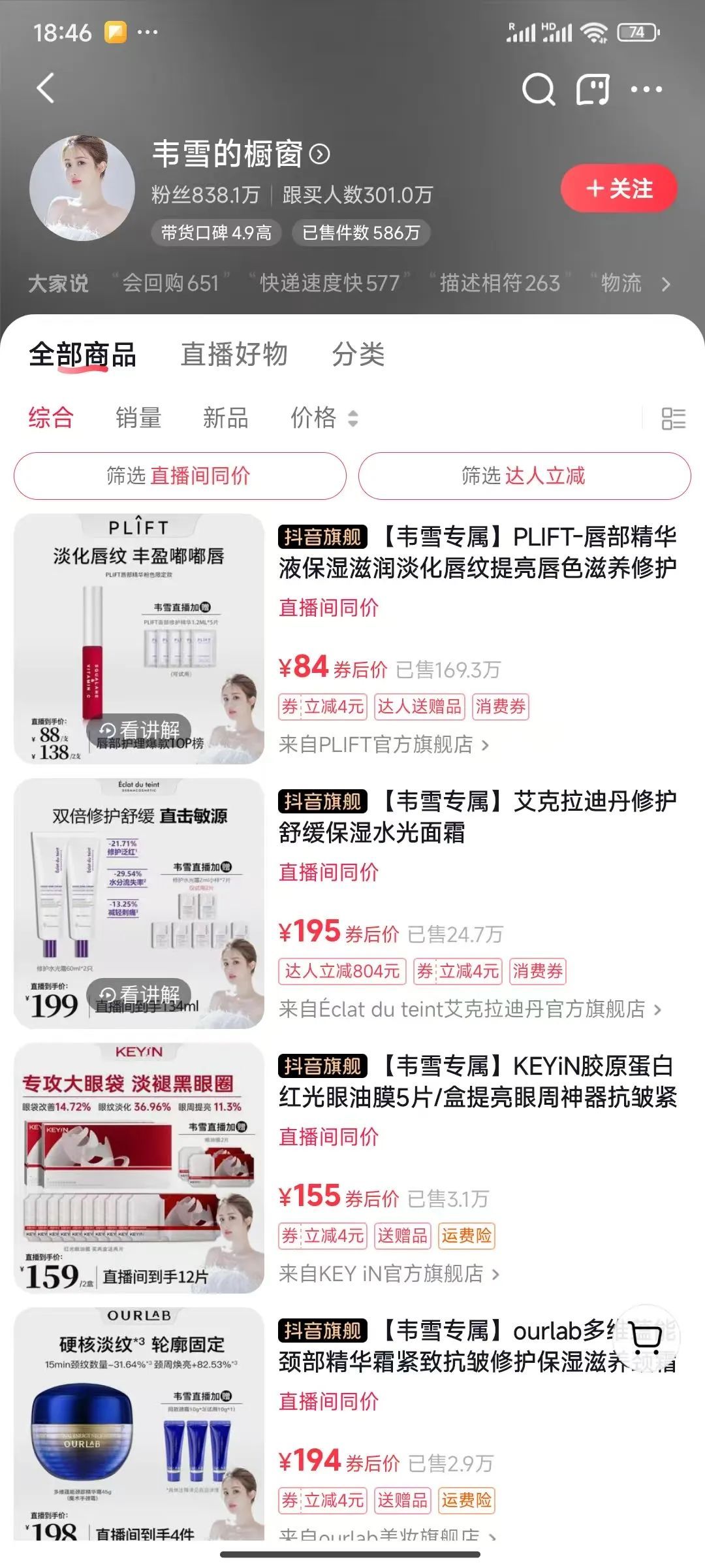 韦雪带货的品类以护肤品为主,其中354元的Yestar艺星面膜、999元的艾克拉迪丹面霜等产品销量领先。业内人士透露,美妆护肤类品牌的达人直播佣金率一般在20%—30%,据此估算,韦雪一个月直播收入可达6000万—9000万元。