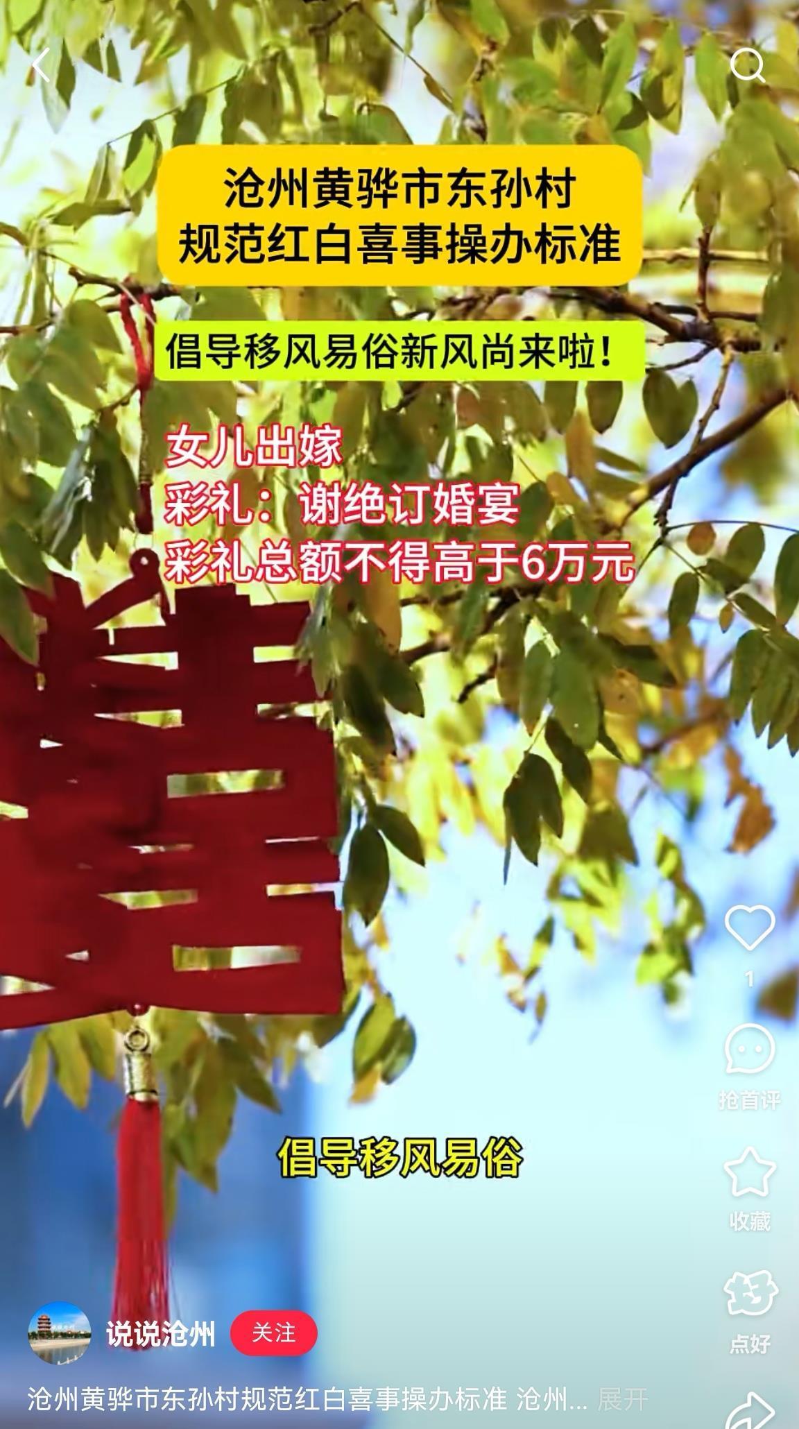 近日,网上传出《东孙村关于规范红白喜事操办标准的通知》,其中规定:谢绝订婚宴,彩礼最高6万元,“改口费”不超2000元。5月29日上午,极目新闻记者联系该村多位村民证实,此事属实。