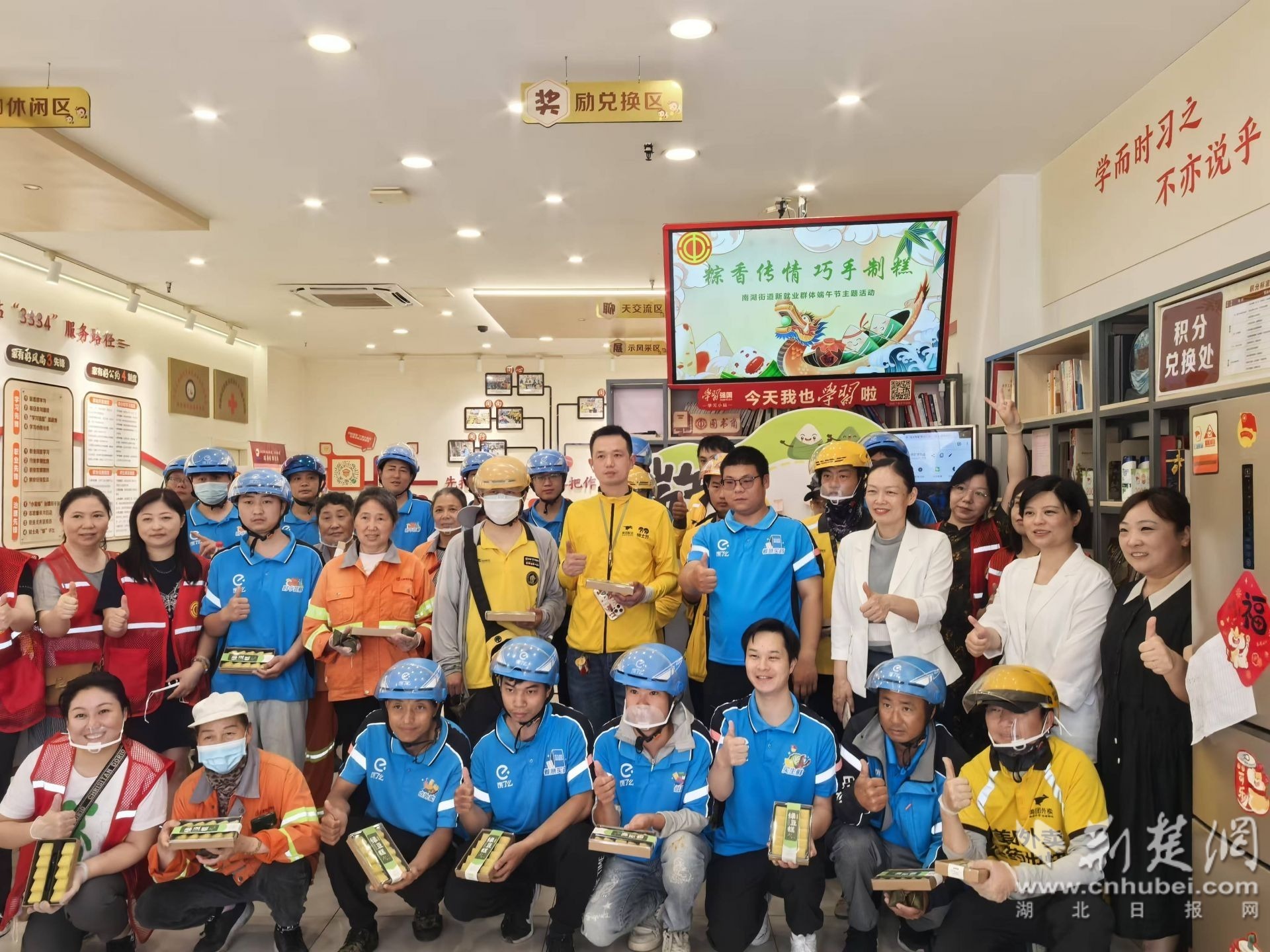 荆楚网(湖北日报网)讯(记者 李燕 通讯员 赵坤 童霞)5月28日,武昌区南湖街道新就业群体服务驿站飘起阵阵粽香,30余名外卖员、快递员、环卫工人等新就业形态劳动者相聚“粽香传情 巧手制糕”端午节特别活动。这场由街道工会主办的民俗体验,让穿梭于城市街巷的劳动者们放下奔波脚步,在手工制作与文化浸润中感受“娘家”的温暖。