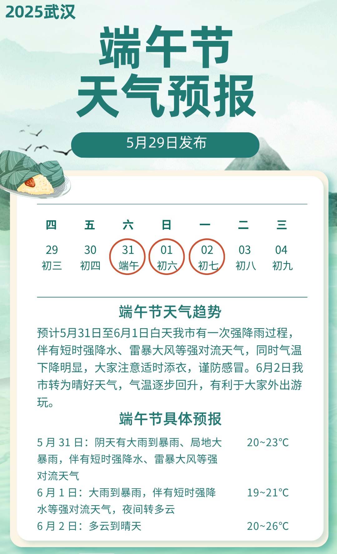 31日至6月1日为降雨最强时段,恩施、荆门、荆州、天门、仙桃、潜江、孝感、咸宁、武汉、鄂州、黄石、黄冈大雨到暴雨,荆州、仙桃、咸宁、武汉、鄂州、黄石、黄冈等局地大暴雨,伴有短时强降水、雷暴大风等强对流天气;其他地区中到大雨,局地暴雨。偏北风3到4级、阵风5到7级。