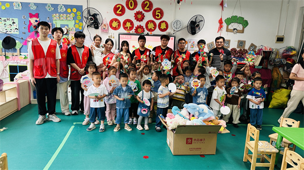 在前进幼儿园,武汉科技职业学院与柴林小学的志愿者为孩子们送上可爱的玩偶礼物,并一起做手工、绘图画、缝制香包、玩游戏。一张张纯真的笑脸,为本次活动增添了别样色彩。