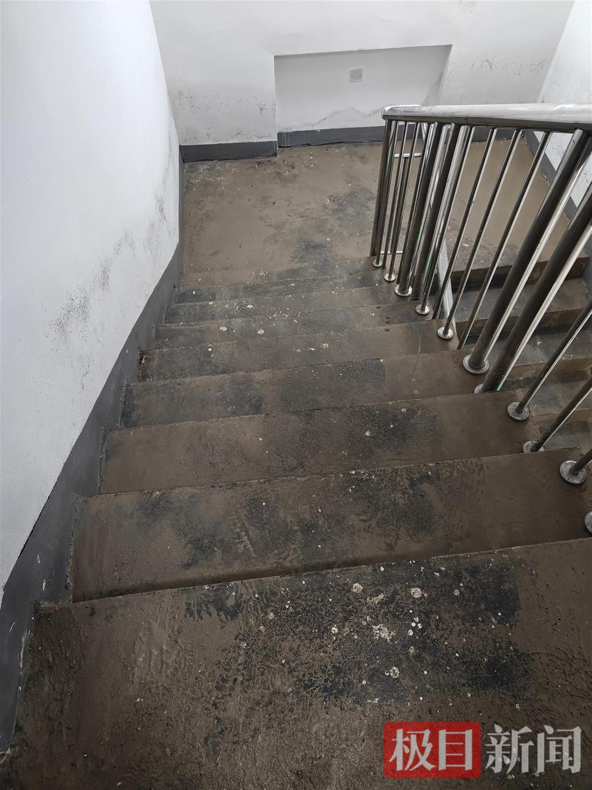 记者从楼梯下到地下车库负三楼爬楼看到,沿途楼梯和墙壁也是湿漉漉一片,四处都是被水泡过的痕迹。