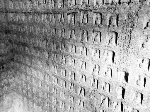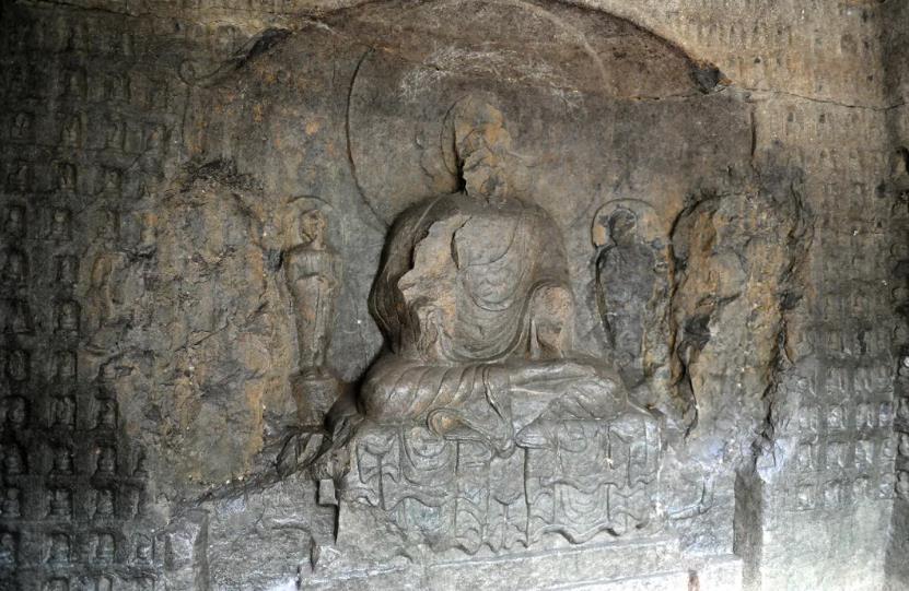 据淇县发布4月30日消息,该石窟名为前嘴石窟,开凿于东魏时期,千百年来一直藏匿于人迹罕至的峭壁之上,20世纪中期又因夺丰水库的修建沉没水中。因窟内雕刻有1043尊栩栩如生的石佛,当地人又称之为千佛洞。石窟洞口仅可容一人进出,内壁并不规整,整体空间约1.9立方米,其中一面石壁正中间有一尊高约0.7米的佛祖雕像,这尊佛像的首部和双掌已被人铲去,但从残存部分也能感受到雕刻工匠杰出的工艺。围绕在洞壁周围的千余尊小佛像,有拳头大小,几乎全被敲掉头部。从仅存的几尊完好小佛像来看,其面部表情栩栩如生,显得庄严恬静,虽然石窟中佛像众多,但各个雕刻精细。