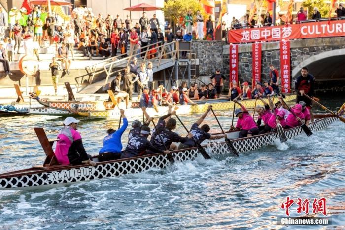 当地时间5月24日,第三届“文化中国·开普敦龙舟节”在南非立法首都开普敦举行。中新社发 弗雷德·巴克 摄