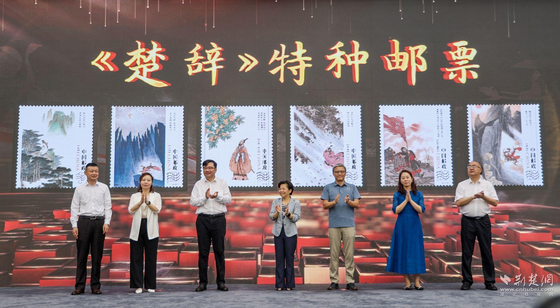 随后,中国邮政集团有限公司湖北省分公司寄递事业部副总经理董红霞宣读邮票发行公告;严红、刘俊等7位嘉宾共同为《楚辞》特种邮票揭幕。