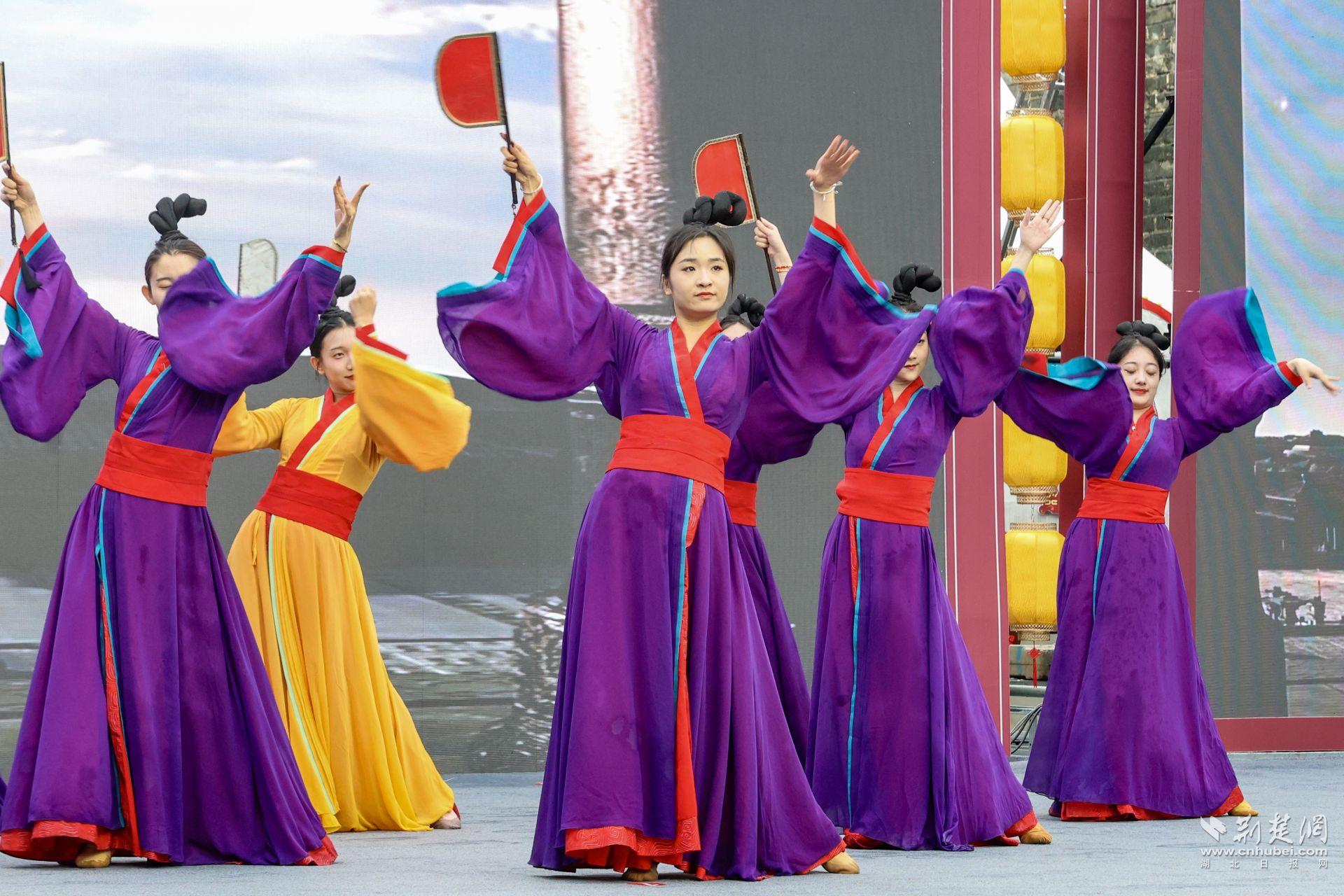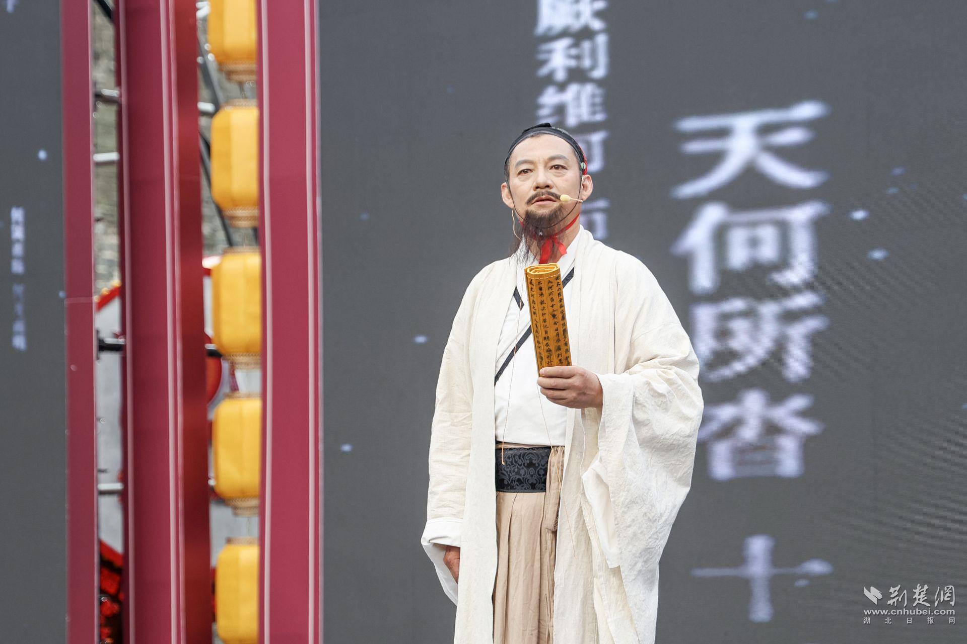 上午8时30分,活动嘉宾陆续踏入宾阳楼瓮城,身着古装的工作人员为其递上《楚辞》主题宣传册,古乐迎宾曲与《楚辞》邮票宣传片交织,拉开活动序幕。9时10分,开场秀《楚韵霓裳战舞风华》震撼上演,演员们以楚绣纹样深衣搭配现代舞美,重现“带长铗之陆离兮,冠切云之崔嵬”的楚地风华,刚柔并济的舞姿与古城墙背景相映成趣,赢得现场掌声雷动。