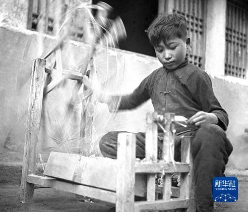 1943年,陕甘宁边区儿童在纺线。郑景康 摄
