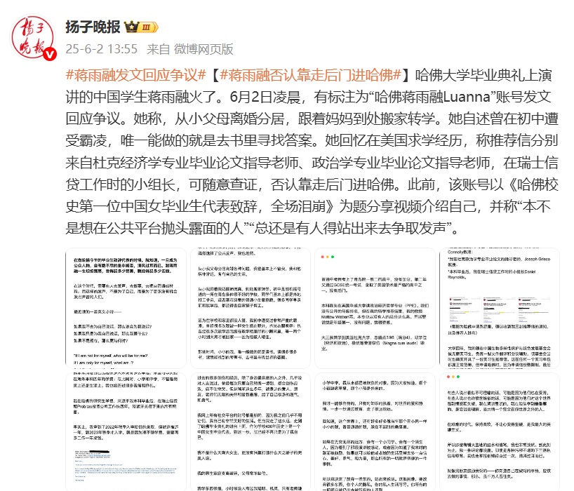 据扬子晚报,6月2日凌晨,有标注为“哈佛蒋雨融Luanna”账号发文回应争议。