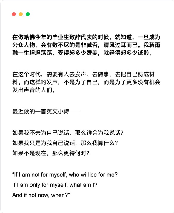 哈佛大学毕业典礼上演讲的中国学生蒋雨融火了。